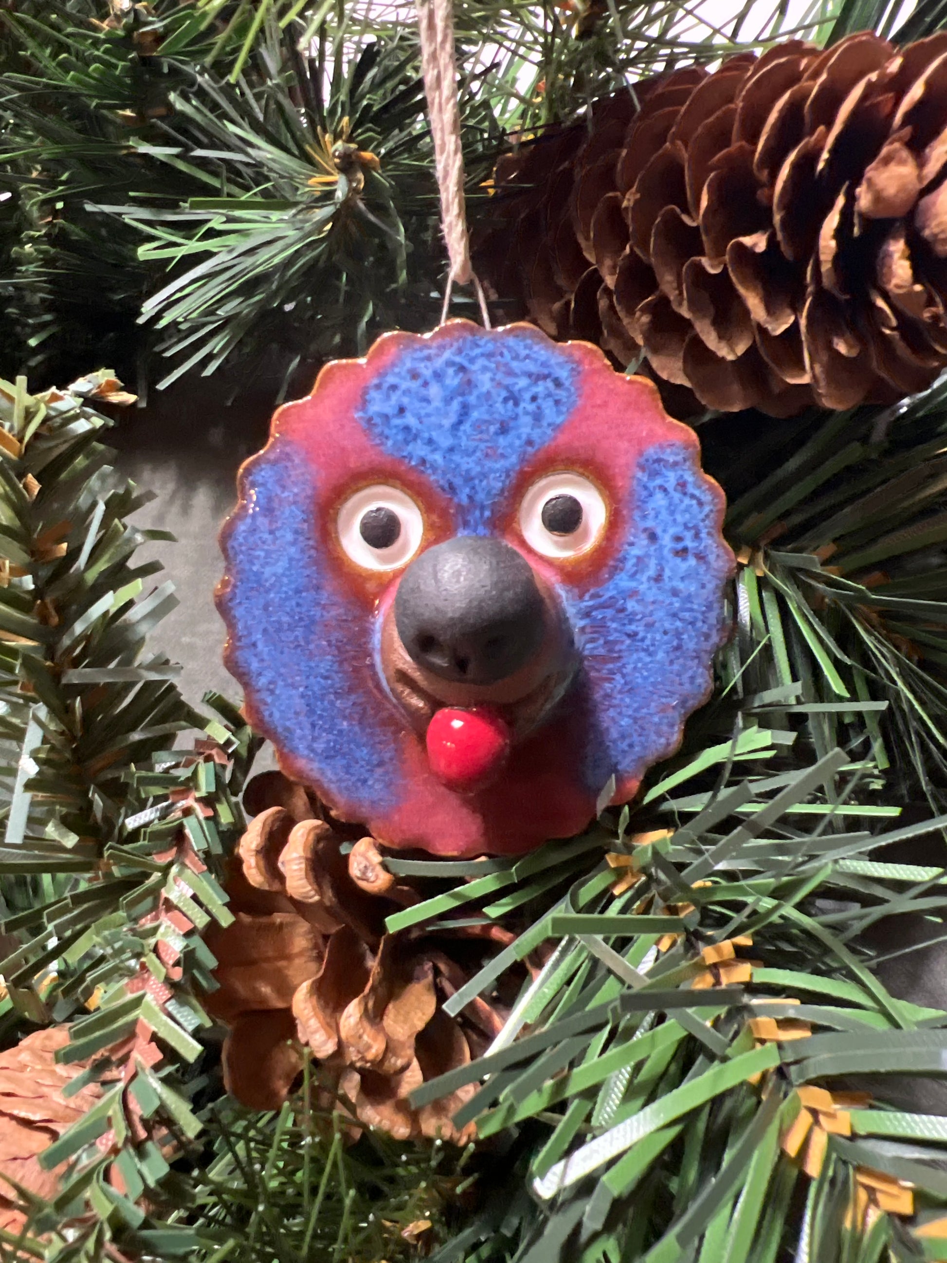 Hand-built and sculpted with signature Rock Dogs features. A metal loop has been adhered to the top of the ornament and is wide enough to hold hemp cord, which is included. Perfect for the holidays or anywhere you love to display ornaments. Approx. two inches in diameter.